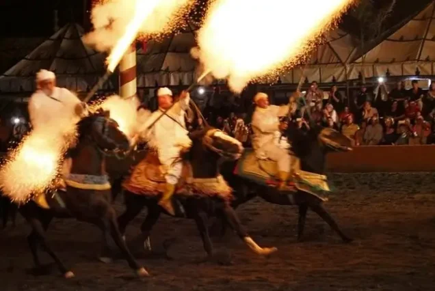 The night culminates in the spectacular Fantasia (Tbourida)—a thunderous display of horsemanship where riders charge and fire antique muskets in unison. It is loud, exciting, and unforgettable.